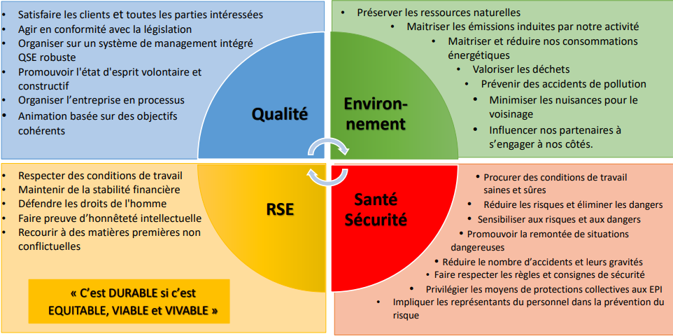 Convaincue de l'importance de la qualité, de la prévention des risques et de la réduction de son impact environnemental, la direction demande à chaque membre de son personnel de respecter et promouvoir ces principes aussi bien en interne qu'à l’extérieur de l'entreprise.